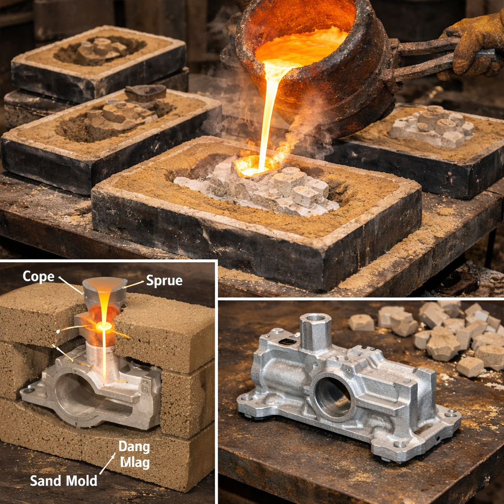 Sand casting is one of the oldest and most versatile metal casting processes, widely used for manufacturing components of various sizes, from small parts to very large industrial castings. In this process, a mold is created using specially prepared sand, which is packed around a pattern to form the desired shape. After removing the pattern, molten metal is poured into the mold cavity and allowed to solidify.